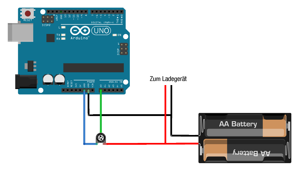 ... Die so erstellte Logdatei kann mit einem einfachen GNUplot-Script zu einer Postscript-Datei gemacht und diese bei Bedarf mit ps2pdf in das PDF-Format konvertiert werden. HardwareDa der von mir benutzte Akku eine Lade-Endspannung von 14,5-14,9 V hat, habe ich ihn über einen Trimmer mit Analogeingang 0 verbunden. Dabei sind die Enden des Trimmers an GND und den Pluspol des Akkus angeschlossen, der Schleifer kommt an den Arduino (Warnung beachten!). Selbstverständlich werden die GND-Anschlüsse von Arduino und Akku miteinander verbunden. Achtung: Vor dem Verbinden von Schleifer und Arduino